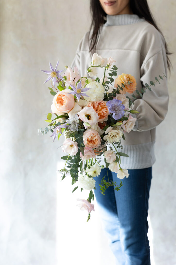 I’ve made the mistake of placing large-headed roses, ranunculus, and more flowers in the tail simply because they were beautiful, and the result was a heavier, bulkier bouquet than I intended. If you tend to add more flowers overall, you can try using fewer flowers than you think you need!